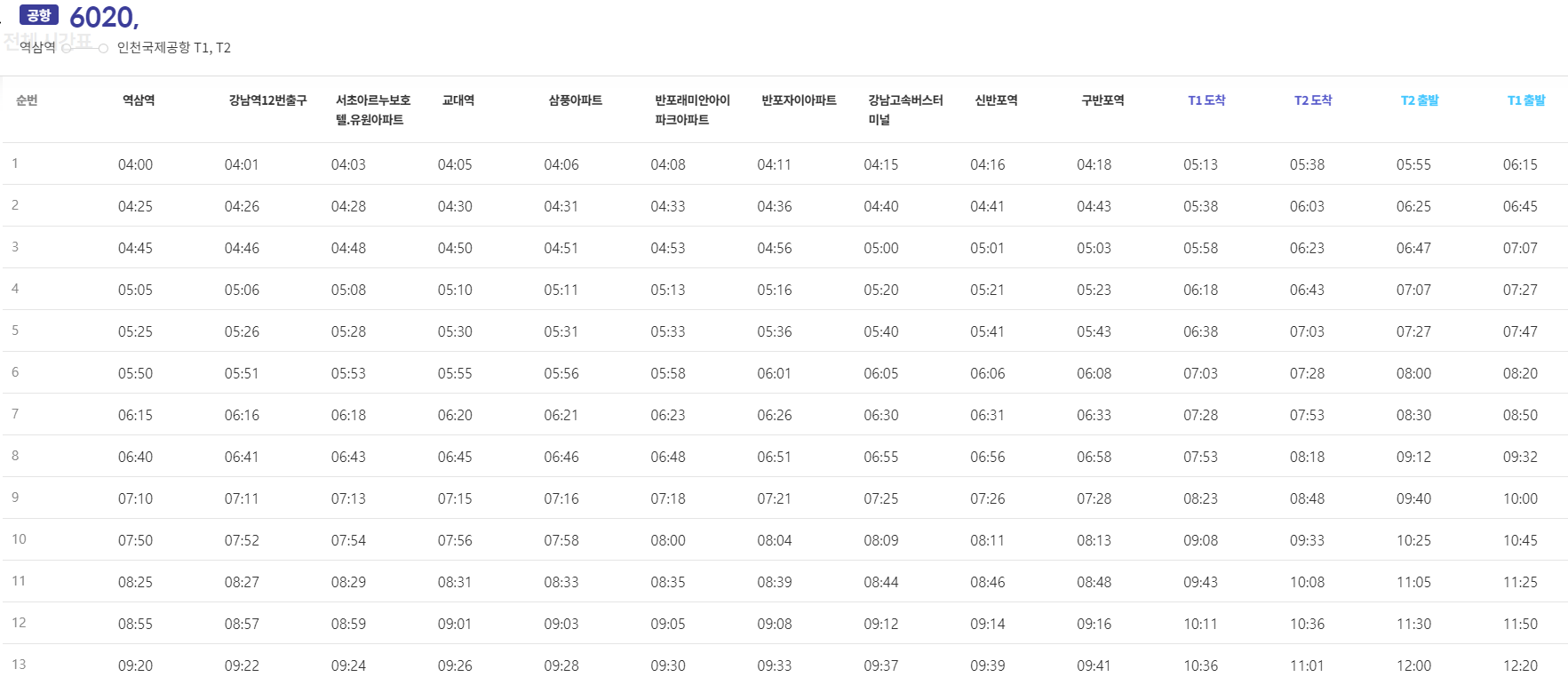 위 링크로 들어가신 다음 다시 한번 '6020 공항버스 시간표'를 클릭하시면 아래와 같이 6020 공항버스 시간표 정류장별로 확인할 수 있습니다.